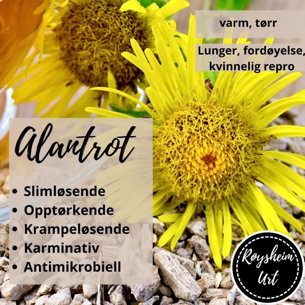 Alantrot er kjent for å være støttende for lungene, et slimløsende middel og kan hjelpe til ved dyptsittende lungetetthet, hoste, sår hals, tørt irritert vev etc. Den er også utmerket for div fordøyelsesproblemer. Les mer om alantrot. Les mer om urter ved forkjølelse